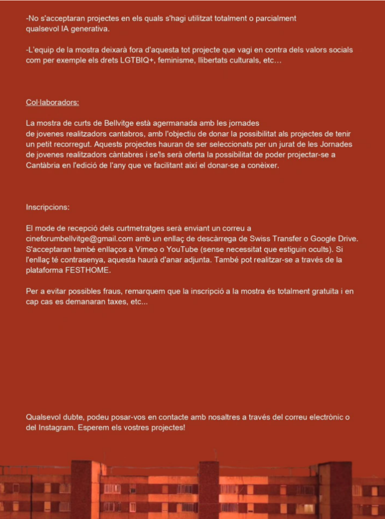 La Mostra estableix també criteris clars de contingut: no s’admetran obres creades amb IA generativa ni projectes que vagin en contra dels valors socials, com ara els drets LGTBIQ+, el feminisme o les llibertats culturals. El jurat, designat per l’organització, valorarà tant la qualitat narrativa com la realització tècnica i formal dels curtmetratges.