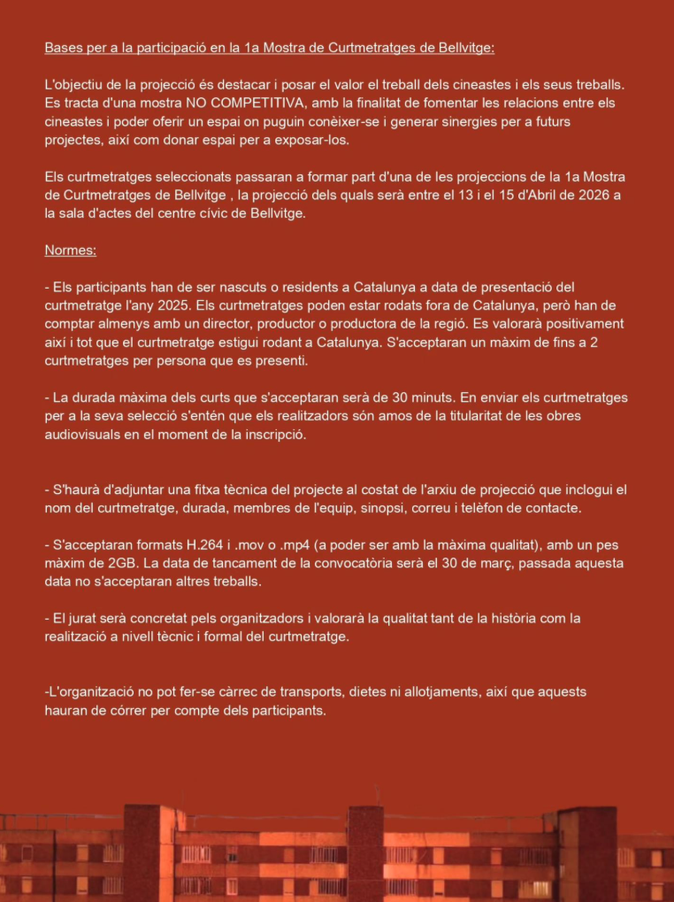 La Mostra tindrà caràcter no competitiu i els curtmetratges seleccionats es projectaran a la sala d’actes del Centre Cultural de Bellvitge entre els dies 13 i 15 d’abril de 2026. A més, alguns dels treballs podrien participar posteriorment en projeccions fora de Catalunya.