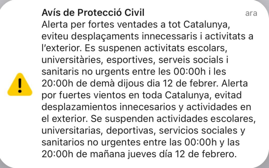 Aquestes mesures se sumen a les que decretat Protecció Civil de Catalunya: la suspensió de l’activitat educativa, universitària i esportiva dijous 12 de febrer i també la sanitària que no sigui urgent, pel temporal de vent històric que afecta tot el país i que preveu fortes ratxes que superaran els 100 km/h a gran part el territori català, segons ha informat el Servei Meteorològic de Catalunya.
