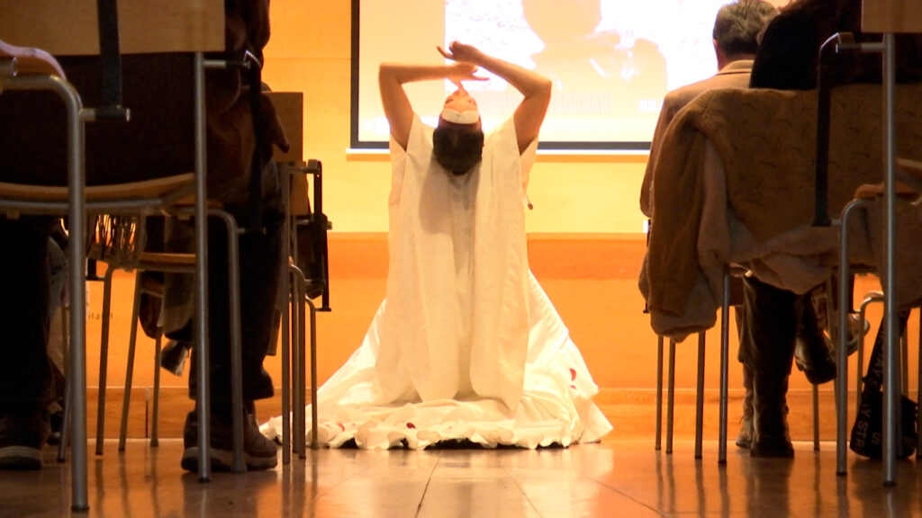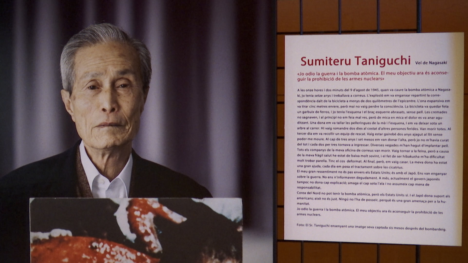 Entre les fotografies, es podia llegir un dels testimonis és Sumiteru Taniguchi, el qual crida: “Odio la guerra i la bomba atòmica. El meu objectiu és aconseguir la prohibició de les armes nuclears.” L’acte també va comptar amb una petita mostra artística de la ballarina i dinamitzadora cultural Kayoko Nakata, que va acompanyar a Lucas a la cerca de testimonis per al seu assaig.