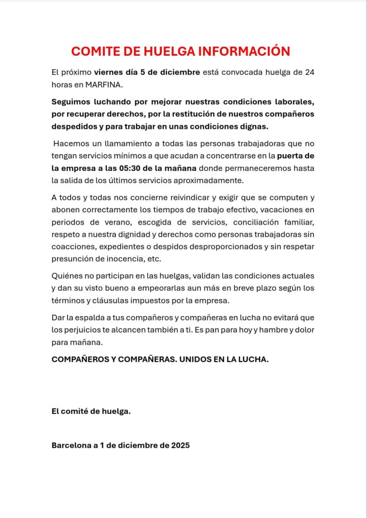 El comitè ha fet una crida a tots els empleats que no tinguin serveis mínims a concentrar-se des de les 5.30 h davant de la seu de l’empresa, on preveuen mantenir-se fins a la sortida dels últims serveis. “Unides i units en la lluita”, conclou el comunicat, alhora que avisa que l’absència de mobilització “valida” les actuals condicions imposades per la direcció.