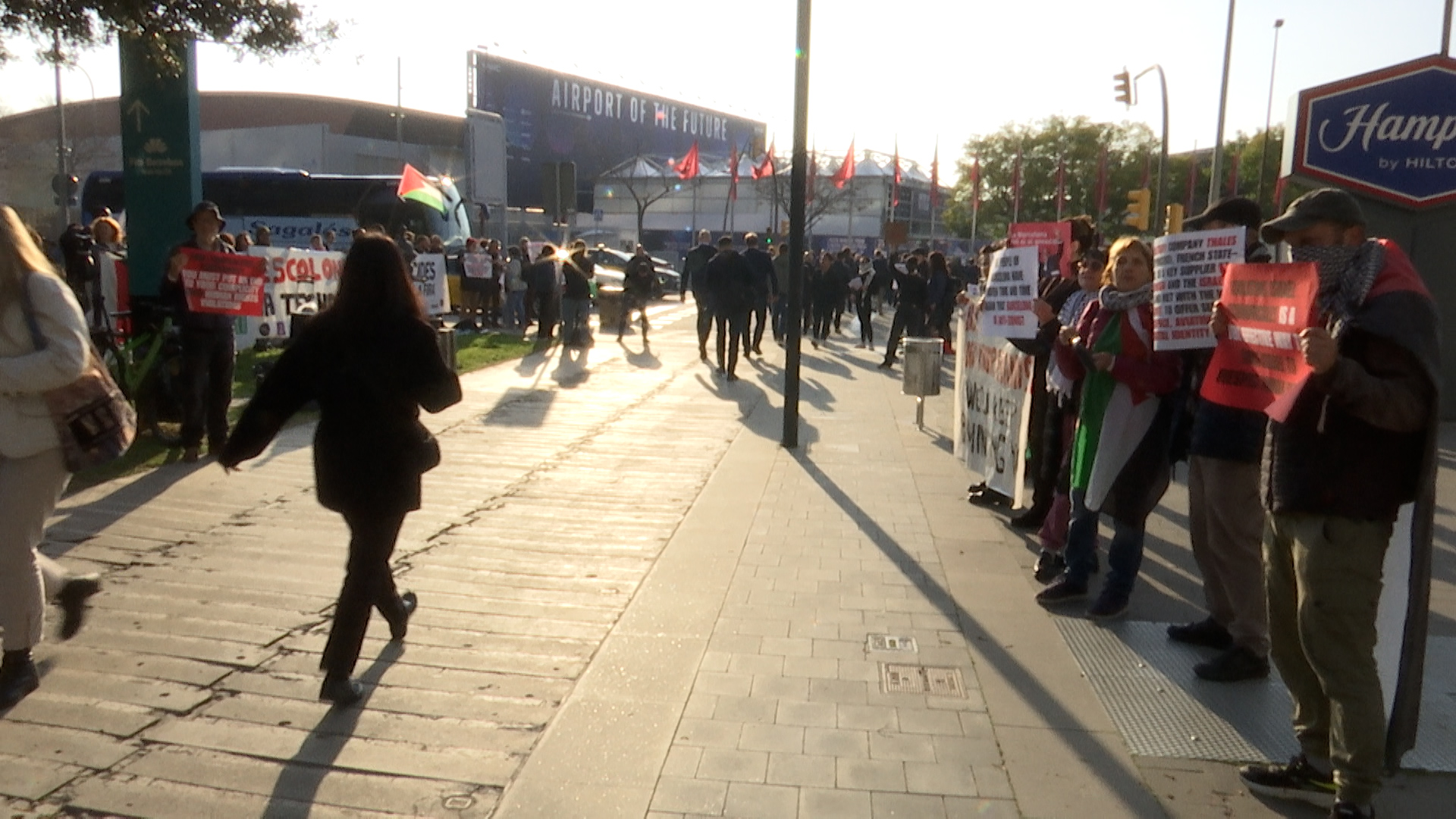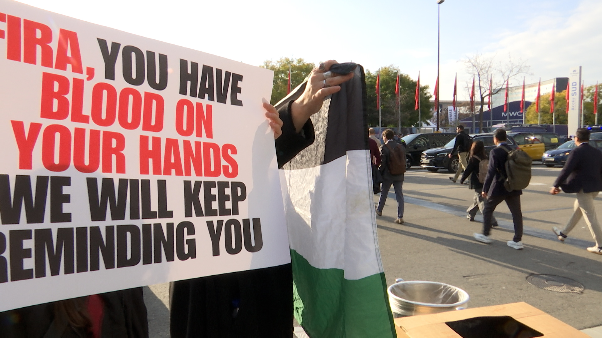 Els manifestants han fet un passadís amb cartells reivindicatius i, enmig de càntics, ha esbroncat els congressistes que arribaven a l’esdeveniment, retrarient-los que empreses del MWC “tenen les mans tacades de sang”.