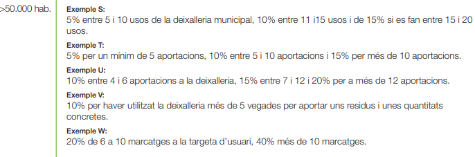 Aquesta bonificació funciona tenint en compte el número de vegades que es fa ús de les deixalleries incloses les mòbils- i en funció del total de visites anuals. En total, es pot aplicar fins a un 14% durant l’any, d’acord amb el barem que s’indica en aquest document.