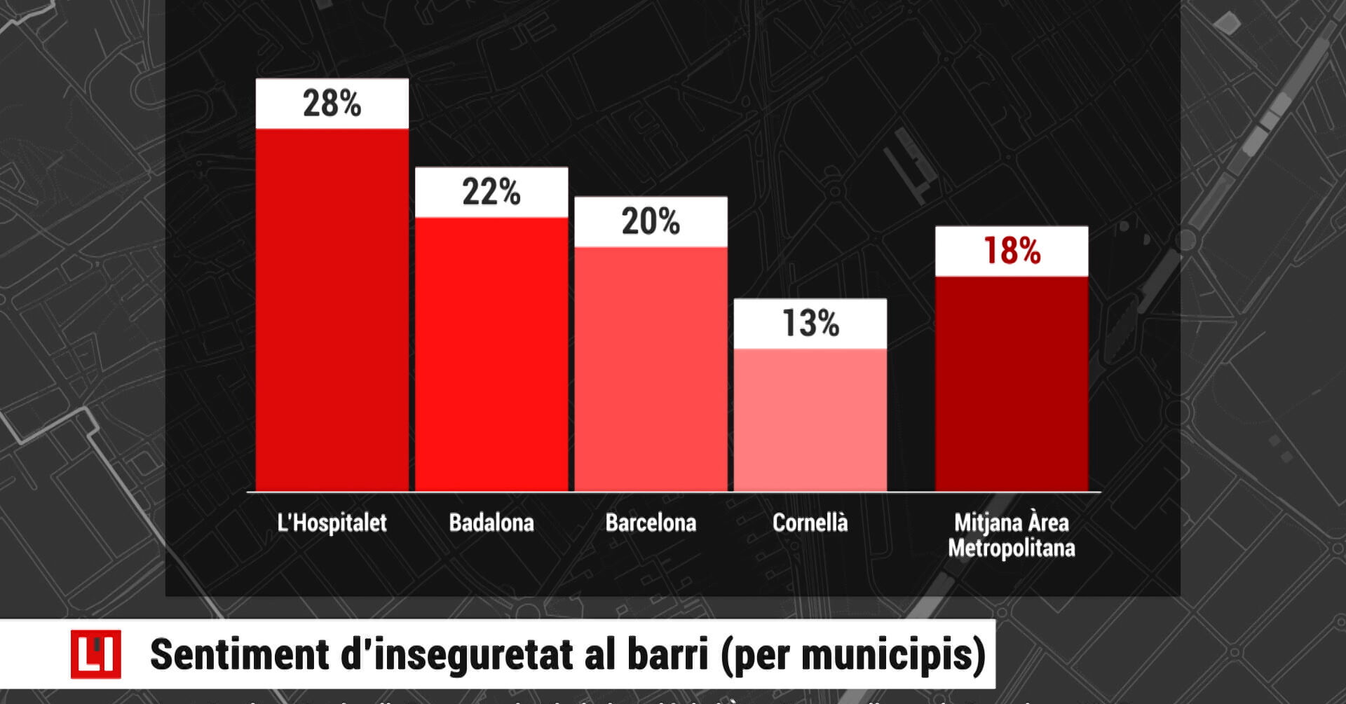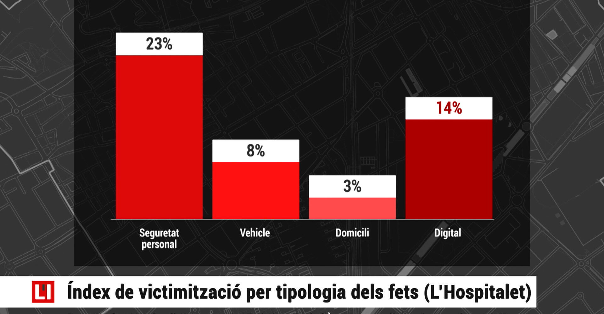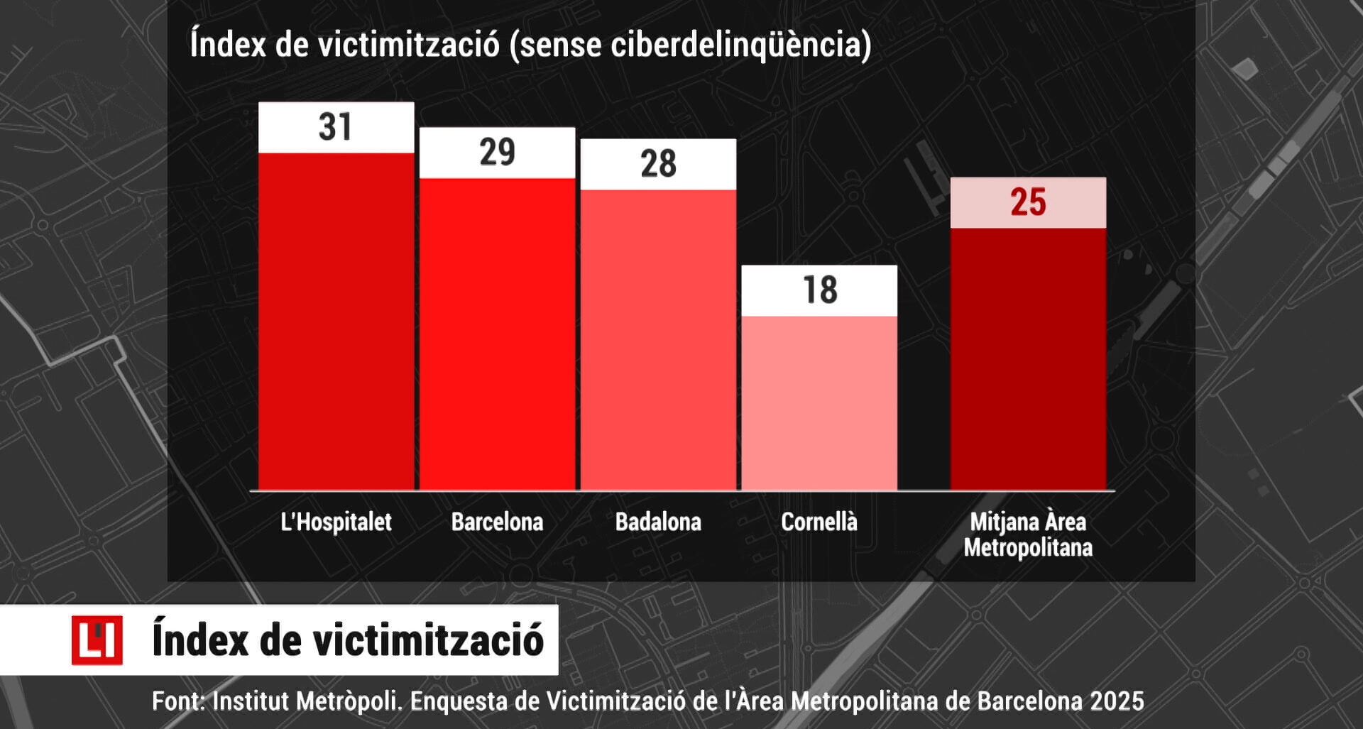 Amb un 31% de població afectada, l’estudi situa L’Hospitalet com la ciutat metropolitana amb un major índex de victimització, prop de Barcelona (29%) i Badalona (28%), i a més distància de ciutats com Cornellà (18%) i de la mitjana municipis de l’entorn (25%).